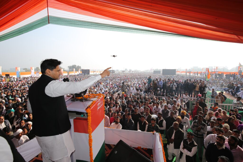 प्रदेश कांग्रेस अध्यक्ष चौ. उदयभान ने प्रधानमंत्री की गारंटियों की पोल खोलते हुए कहा कि 2022 तक किसानों की दोगुनी आमदनी, स्वामीनाथन आयोग की सिफारिशों को लागू करने, किसानों को सी-2 $ 50 प्रतिशत मुनाफा जोड़कर एमएसपी देने की गारंटी दी गई थी लेकिन सत्ता में बैठे लोगों ने चंद बड़े उद्योगपतियों के साथ मिलकर किसानों को धोखा दिया और तीन काले कृषि कानून ले आये। जब किसान आंदोलित हो गये तो उन्हें तरह-तरह से बदनाम करने अपमानित करने का काम किया। लेकिन किसान अपने सिर पर कफन पर बांधकर गये और 13 महीनों में सरकार को झुकाने का काम किया। इस सरकार ने किसानों को झांसा देकर आंदोलन खत्म तो करा दिया लेकिन एक बार फिर धोखा किया। इस सरकार ने अग्निवीर योजना लाकर देश की फौज को और नौजवानों को भी धोखा दिया है। उन्होंने हुड्डा सरकार के कामों की चर्चा करते हुए कहा कि हुड्डा जी के नेतृत्व वाली कांग्रेस सरकार ने हर वर्ग के लिये काम किया। प्रदेशभर में बिजली कारखाने लगवाए, मेट्रो का जाल बिछाया, 6 रेल लाईन, 16 यूनिवर्सिटी और मेडिकल कॉलेज बनवाये। लेकिन इस सरकार ने प्रदेश की अर्थव्यवस्था पूरी तरह चौपट कर दी। इस सरकार ने शिक्षा और स्वास्थ्य में भी प्रदेश की जनता को धोखा देने का काम कर रही है। गरीब, दलित, पिछड़े वंचित समाज के बच्चों को शिक्षा से महरुम करने का काम किया जा रहा है। इस सरकार को उखाड़ फेंकने के लिये काम करने की जरुरत है। आज हरियाणा पर 4 लाख करोड़ रुपये का कर्ज है यानी प्रदेश में पैदा होने वाले हर बच्चे पर 132800 रुपये का कर्ज लेकर पैदा हो रहा है। उन्होंने इनेलो और जेजेपी से सावधान रहने की बात कहते हुए कहा कि बीजेपी की बी-टीमों को हरा कर बीजेपी को उखाड़ फेंकें।