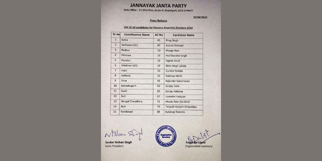 हरियाणा विधानसभा चुनाव के लिए दुष्यंत चौटाला की जन नायक जनता पार्टी (जेजेपी) ने कुछ दिन पहले 7 उम्मीदवार घोषित करने के बाद आज 15 और उम्मीदवारों के नामों की सूची जारी कर दी है। जेजेपी ने एक पूर्व विधायक को भी टिकट दिया है। इसके आलवा जननायक जनता पार्टी ने अपने गृह जिले सिरसा विधानसभा सीट पर भी राजेंद्र गनेरीवाला को मैदान में उतारा है।