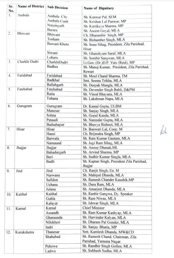 हरियाणा सरकार ने 26 जनवरी, 2024 को गणतंत्र दिवस के अवसर पर राष्ट्रीय ध्वज फहराने के लिए सूची जारी की है। सूची मुताबिक कृषि मंत्री जेपी दलाल रोहतक में गणतंत्र दिवस के अवसर पर राष्ट्रीय ध्वज फहराएँगे। हरियाणा के गृह मंत्री अनिल विज यमुनानगर जिला के जगाधरी में 26 जनवरी गणतंत्र दिवस के अवसर पर राष्ट्रीय ध्वज फहराएँगे। उप मुख्यमंत्री दुष्यंत चौटाला सिरसा में गणतंत्र दिवस के अवसर पर राष्ट्रीय ध्वज फहराएँगे। डबवाली में विधायक नैना सिंह चौटाला राष्ट्रीय ध्वज फहराएँगे ।