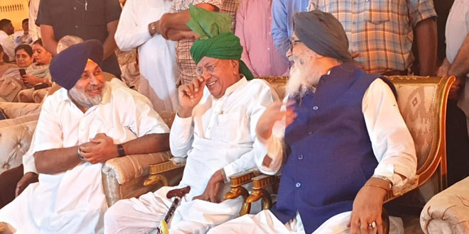 पूर्व मुख्यमंत्री ओमप्रकाश चौटाला किसी बात पर हँसते हुए उनके साथ हैं पूर्व मुख्यमंत्री प्रकाश सिंह बादल व पूर्व उप मुख्यमंत्री सुखबीर सिंह बादल।