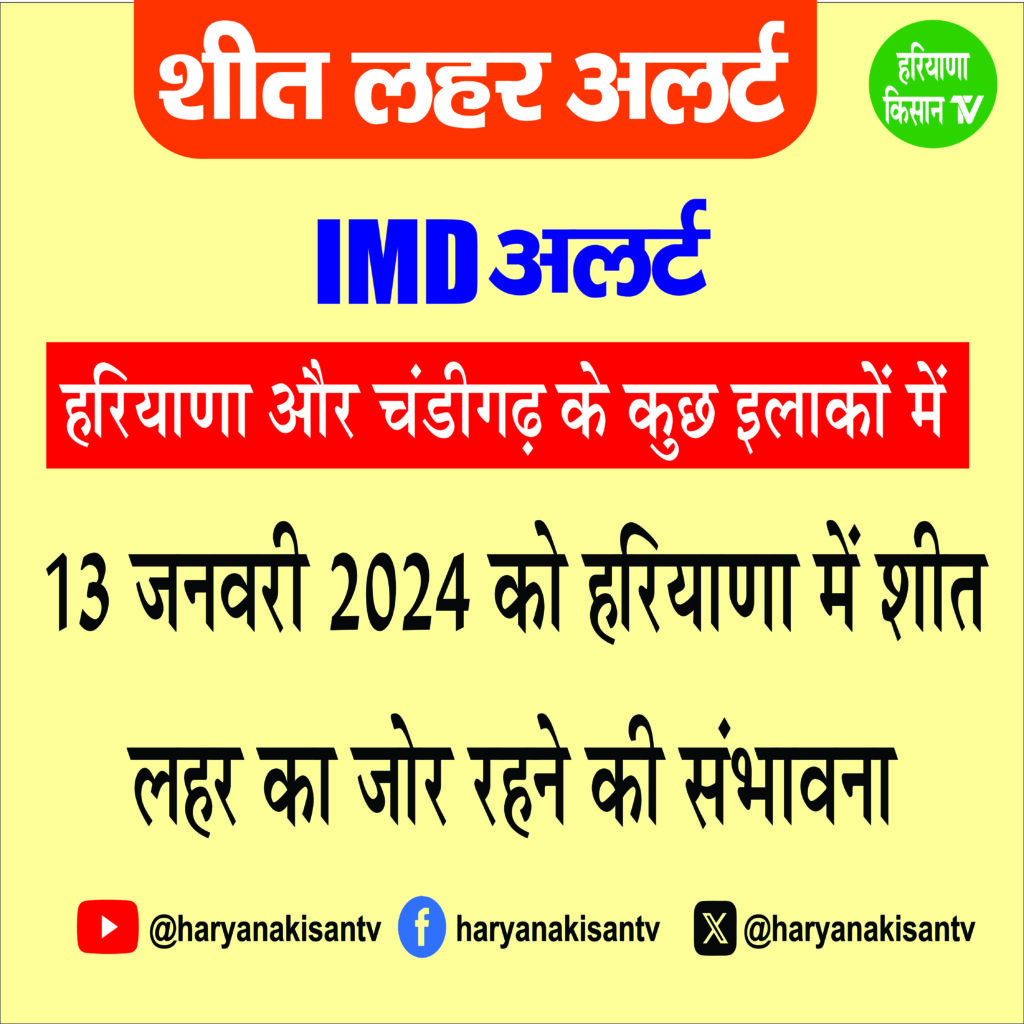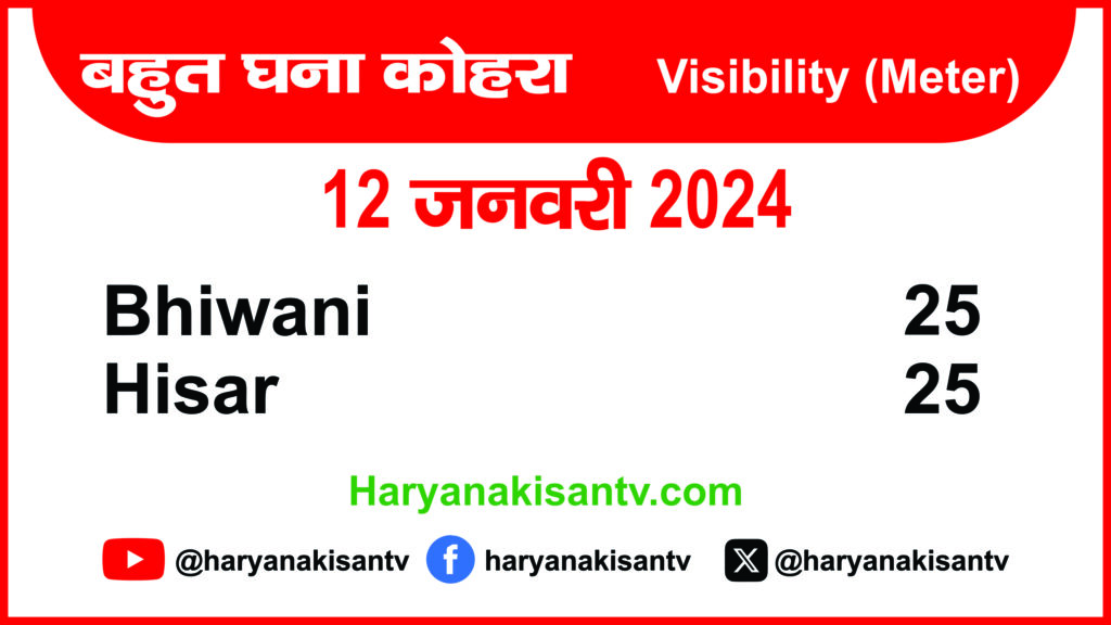 भारत मौसम विज्ञान विभाग ने हरियाणा में शीत लहर चलने को लेकर बड़ा अलर्ट जारी किया है। IMD के अलर्ट के मुताबिक 13 जनवरी 2024 को हरियाणा के कुछ इलाकों में गंभीर शीत लहर चलने की संभावना है। 12 जनवरी 2024 को हरियाणा के हिसार जिला के बालसमद 0.4 डिग्री सेल्सियस तापमान के साथ प्रदेश में सबसे ठंठा स्थान रहा। वहीं अगर घने कोहरे की बात करें तो आज 12 जनवरी को प्रदेश में बहुत घना कोहरा हिसार और भिवानी में देखने को मिला। हिसार में 12 जनवरी 2024 की सुबह कोहरे की वजह से दृश्यता 50 मीटर रही। भिवानी में भी दृश्यता 50 मीटर तक ही रही। भारत मौसम विज्ञान विभाग हरियाणा में कोहरे को लेकर ऑरेंज अलर्ट जारी कर चुका है। 11 जनवरी से 15 जनवरी तक हरियाणा में रात और सुबह के कुछ घंटों में घने से बहुत घना कोहरा छाए रहने की संभावना जता चुका है।